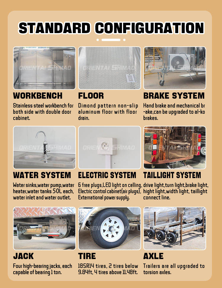 Что касается материала аксессуаров, мы также настаиваем на высококачественном выборе, включая ручки из нержавеющей стали, петли и колеса и другие ключевые компоненты, которые изготовлены из высококачественных материалов. Этот дизайн не только обеспечивает общую последовательность и эстетику корпоративного кухонного фургона, но также повышает его долговечность и надежность. Превосходная производительность аксессуаров позволяет корпоративному кухонному фургону быть более стабильным и плавным в процессе использования, а также снижает затраты на обслуживание и замену, вызванные повреждением аксессуаров, что приводит пользователей более беспрепятственный и экономичный опыт использования.