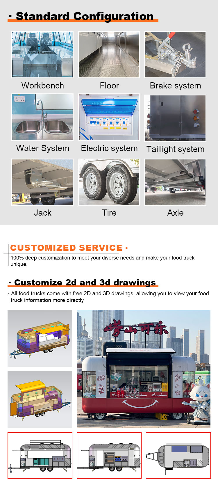 В качестве основного материала мы выбрали высококачественную нержавеющую сталь 304, которая известна своей превосходной коррозионной стойкостью и превосходной долговечностью и может сохранять стабильные характеристики в различных условиях окружающей среды, гарантируя, что наши продукты для прицепов для общественного питания смогут сохранять свое превосходное качество и функциональность даже в долгосрочной перспективе и решать множество задач. Нержавеющая сталь 304 обладает превосходной устойчивостью к коррозии, поэтому грузовик не подвергается воздействию окисления или ржавчины, что значительно продлевает срок его службы. Превосходная коррозионная стойкость нержавеющей стали 304 делает грузовик менее подверженным окислению и ржавчине, что значительно продлевает срок его службы.