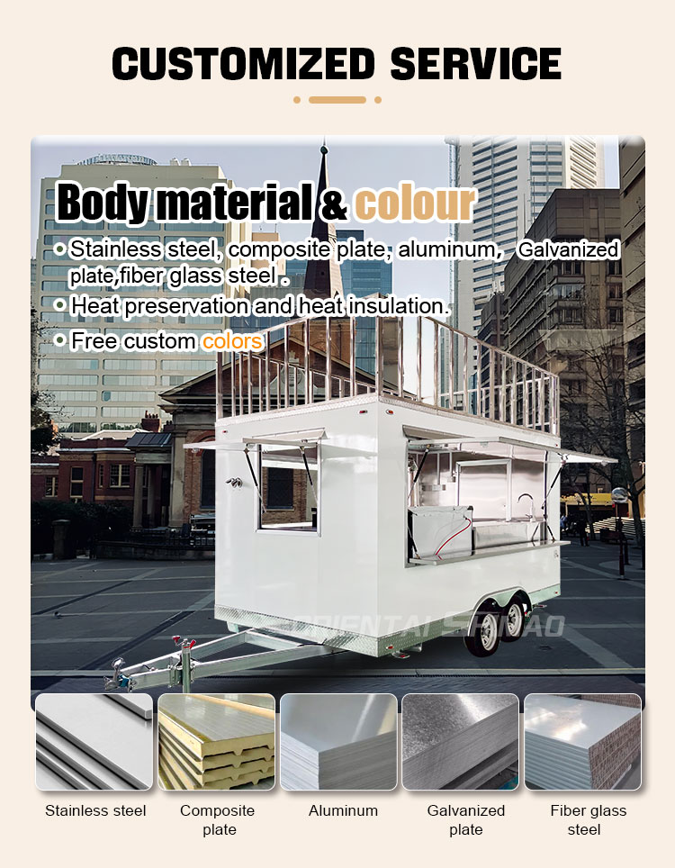 Персонализация материала: Выбор материала напрямую связан с долговечностью, эстетикой и безопасностью пищевого фургона. Мы предлагаем широкий выбор материалов корпуса: от прочного алюминиевого сплава до легкого углеродного волокна, от классической нержавеющей стали до энергосберегающих композитных материалов, каждый из которых имеет свои уникальные преимущества и сценарии применения. При этом мы также уделяем внимание деталям, будь то материал колес, прочность тяговой рамы или удобство домкрата. Мы настраиваем его в соответствии с вашими реальными потребностями, чтобы гарантировать оптимальную производительность каждой части пищевого грузовика.