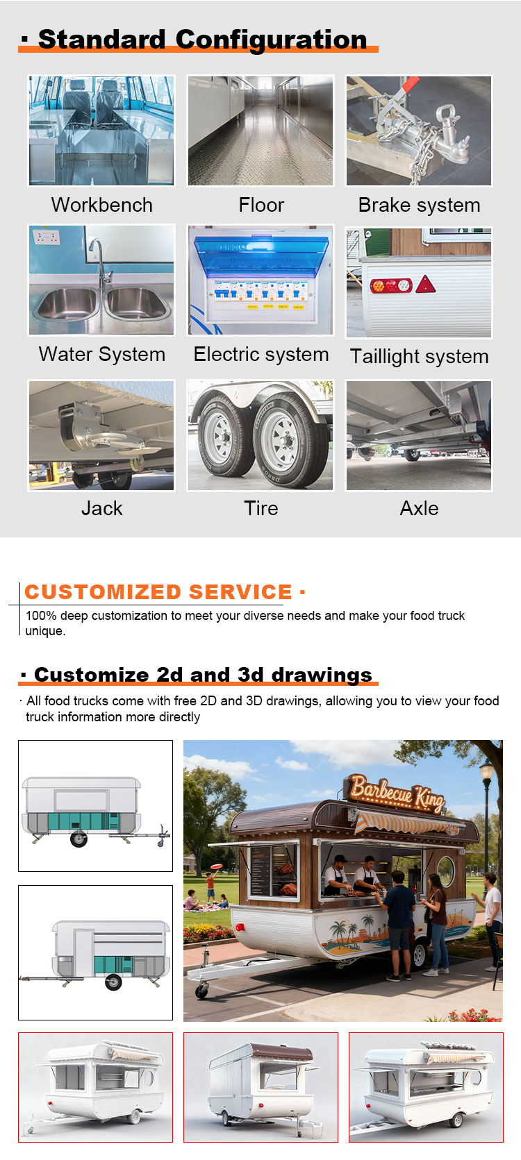 В качестве основного материала мы выбрали высококачественную нержавеющую сталь 304, которая известна своей превосходной коррозионной стойкостью и превосходной долговечностью и может сохранять стабильные характеристики в различных условиях окружающей среды, гарантируя, что наши продукты для прицепов для общественного питания смогут сохранять свое превосходное качество и функциональность даже в долгосрочной перспективе и решать множество задач. Нержавеющая сталь 304 обладает превосходной устойчивостью к коррозии, поэтому грузовик не подвергается воздействию окисления или ржавчины, что значительно продлевает срок его службы. Превосходная коррозионная стойкость нержавеющей стали 304 делает грузовик менее подверженным окислению и ржавчине, что значительно продлевает срок его службы.