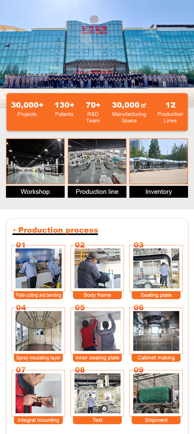 От анализа потребностей и индивидуального проектирования, выбора и закупки материалов, производства, установки внутреннего оборудования, внешней отделки и вывесок, испытаний и контроля качества, распространения и установки до послепродажного обслуживания и технического обслуживания — мы будем с вами на каждом этапе пути.