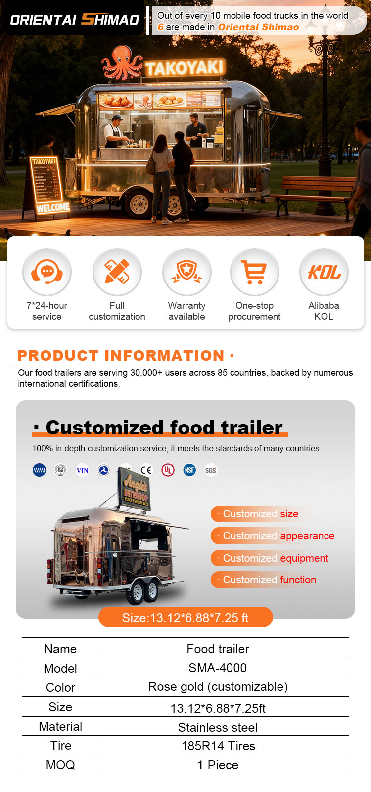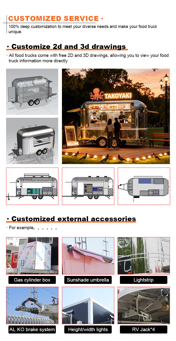 В качестве основного материала мы выбрали высококачественную нержавеющую сталь 304, которая известна своей превосходной коррозионной стойкостью и превосходной долговечностью и может сохранять стабильные характеристики в различных условиях окружающей среды, гарантируя, что наши продукты для прицепов для общественного питания смогут сохранять свое превосходное качество и функциональность даже в долгосрочной перспективе и решать множество задач. Нержавеющая сталь 304 обладает превосходной устойчивостью к коррозии, поэтому грузовик не подвергается воздействию окисления или ржавчины, что значительно продлевает срок его службы. Превосходная коррозионная стойкость нержавеющей стали 304 делает грузовик менее подверженным окислению и ржавчине, что значительно продлевает срок его службы.