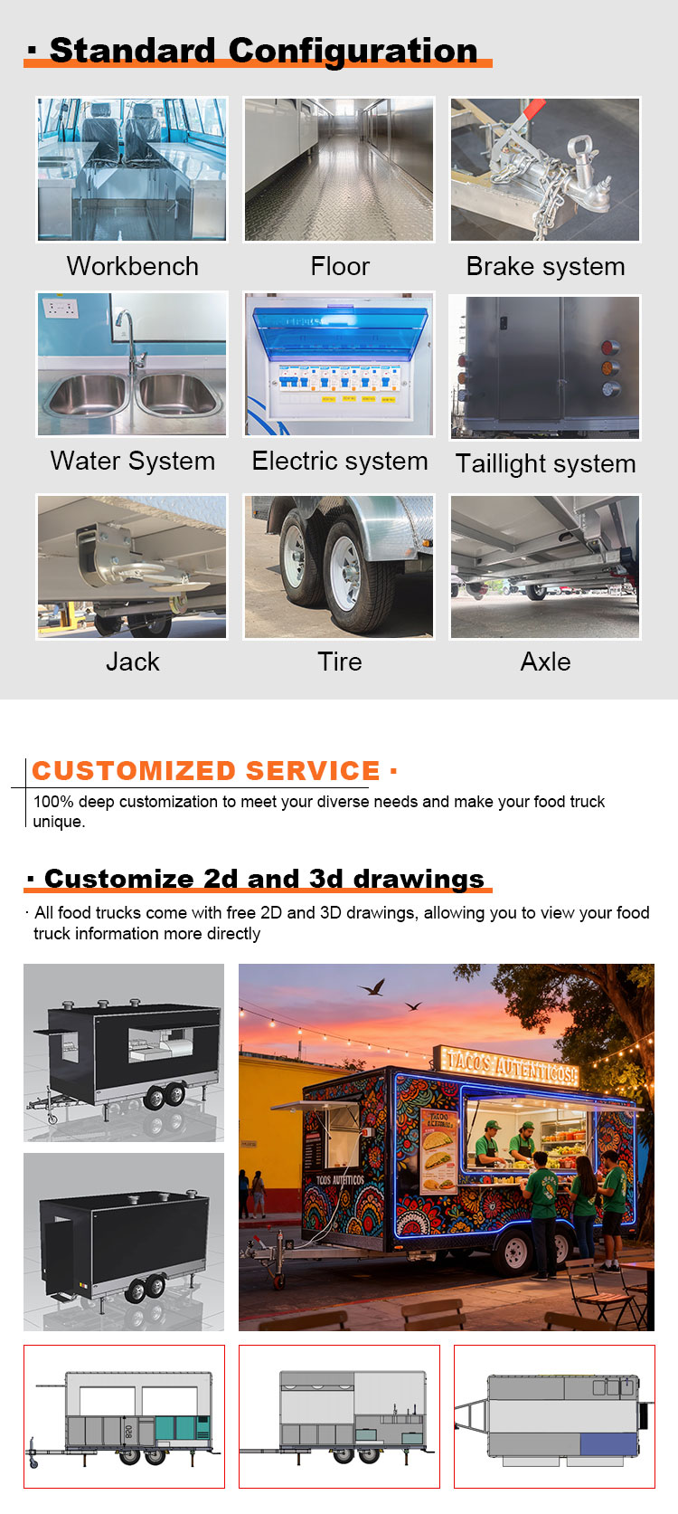 В качестве основного материала мы выбрали высококачественную нержавеющую сталь 304, которая известна своей превосходной коррозионной стойкостью и превосходной долговечностью и может сохранять стабильные характеристики в различных условиях окружающей среды, гарантируя, что наши продукты для прицепов для общественного питания смогут сохранять свое превосходное качество и функциональность даже в долгосрочной перспективе и решать множество задач. Нержавеющая сталь 304 обладает превосходной устойчивостью к коррозии, поэтому грузовик не подвергается воздействию окисления или ржавчины, что значительно продлевает срок его службы. Превосходная коррозионная стойкость нержавеющей стали 304 делает грузовик менее подверженным окислению и ржавчине, что значительно продлевает срок его службы.