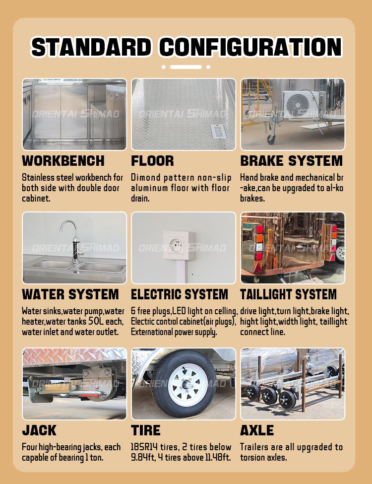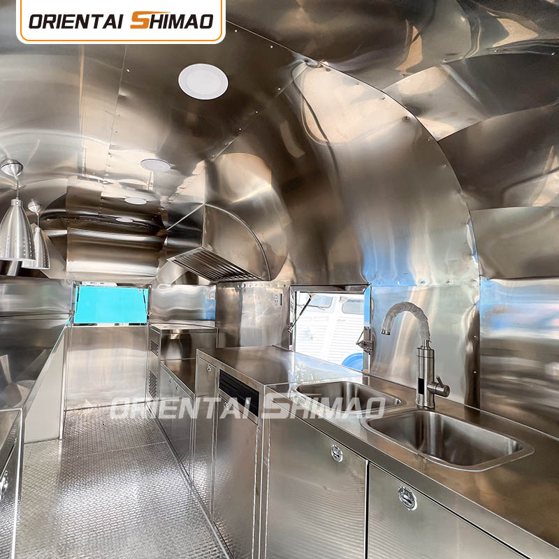 Золотистая нержавеющая сталь: внешняя часть фургона для еды изготовлена из высококачественной золотой нержавеющей стали. Этот материал не только обладает превосходной стойкостью к коррозии и истиранию, но и золотистый внешний вид увеличивает визуальную красоту и ощущение высокого качества, благодаря чему грузовик с едой может выделяться в различных условиях.