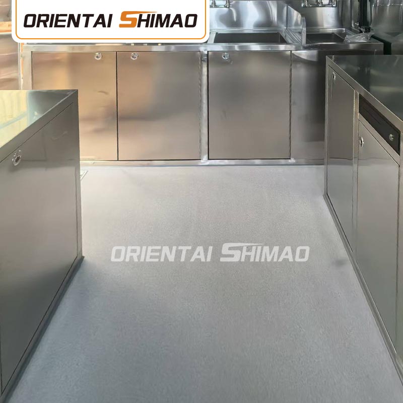 Трехслойный пол: Пол фургона с едой выполнен трехслойным. Верхний слой представляет собой алюминиевый пол с нескользящей поверхностью, обеспечивающий безопасность операторов; средний слой — импортированная из Австралии деревянная доска, устойчивая к насекомым; а нижний слой представляет собой армированный стекловолокном пластик, который устойчив к влаге и насекомым и продлевает срок службы пола.