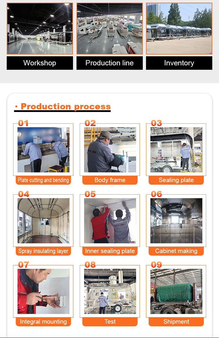 В качестве основного материала мы выбрали высококачественную нержавеющую сталь 304, которая известна своей превосходной коррозионной стойкостью и превосходной долговечностью и может сохранять стабильные характеристики в различных условиях окружающей среды, гарантируя, что наши продукты Trailer Food Truck сохранят свое превосходное качество и функциональность даже в долгосрочной перспективе и справятся с множеством проблем. Нержавеющая сталь 304 обладает превосходной устойчивостью к коррозии, поэтому грузовик не подвергается воздействию окисления или ржавчины, что значительно продлевает срок его службы. Превосходная коррозионная стойкость нержавеющей стали 304 делает грузовик менее подверженным окислению и ржавчине, что значительно продлевает срок его службы.